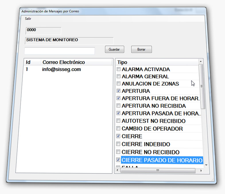 Una vez elegido la dirección de correo se deben indicar las opciones de tipo que el sistema enviará a cada dirección.
